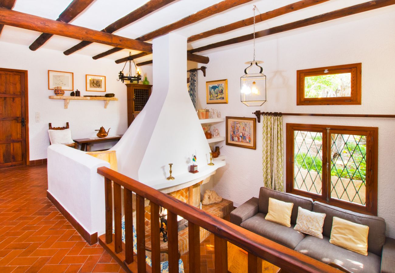 À l'intérieur, le salon reflète le charme rustique majorquin avec des plafonds à poutres de bois apparentes et un mobilier noble autour de la cheminée. L'ambiance est complétée par un canapé confortable, une table centrale et deux fauteuils à bascule majorquins d'époque, aux côtés d'éléments originaux tels que des fenêtres en acier et du bois clair restauré.