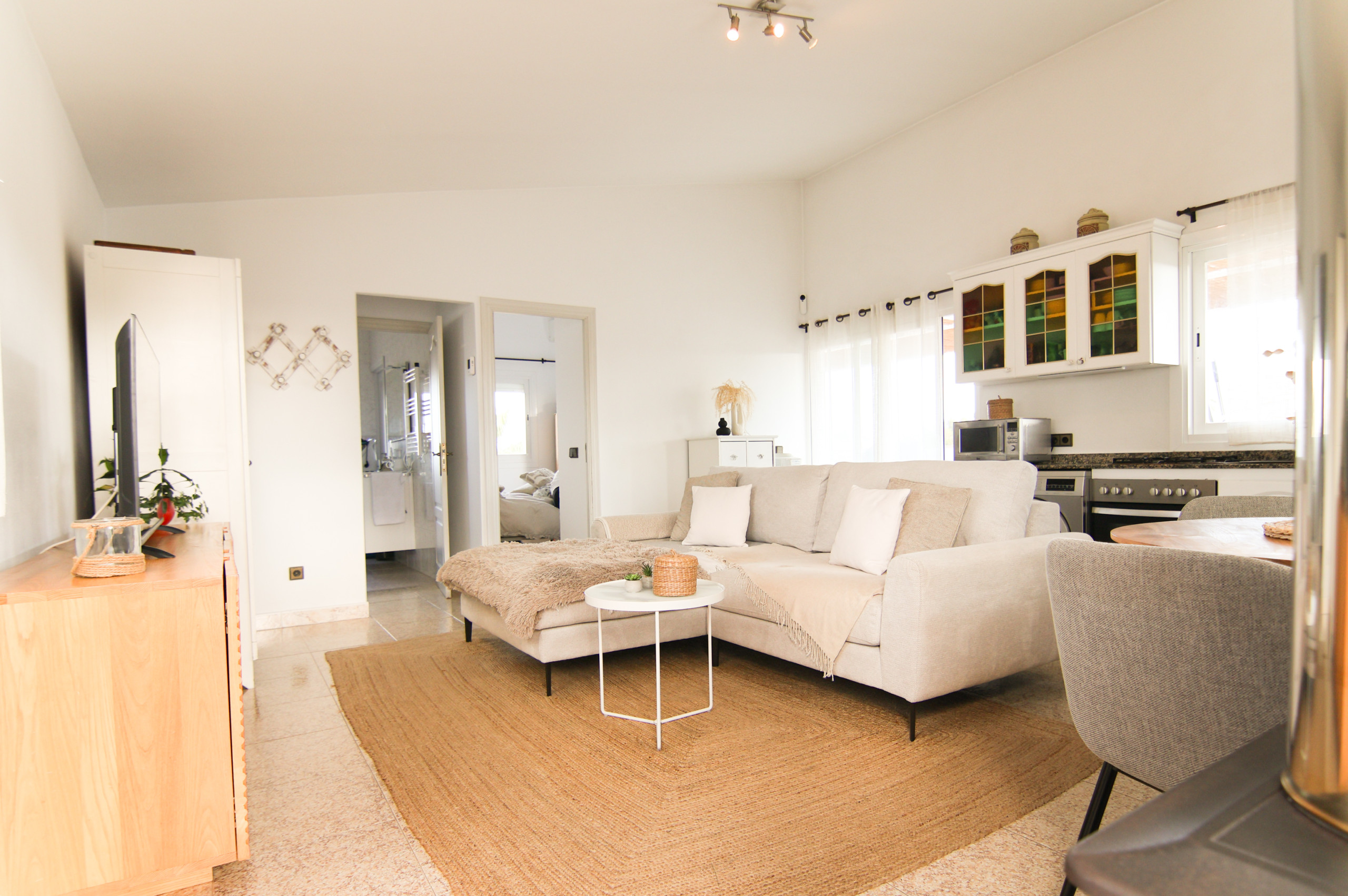 Spacious lounge-diner with satellite television, comfortable sofa and direct access to the exterior.