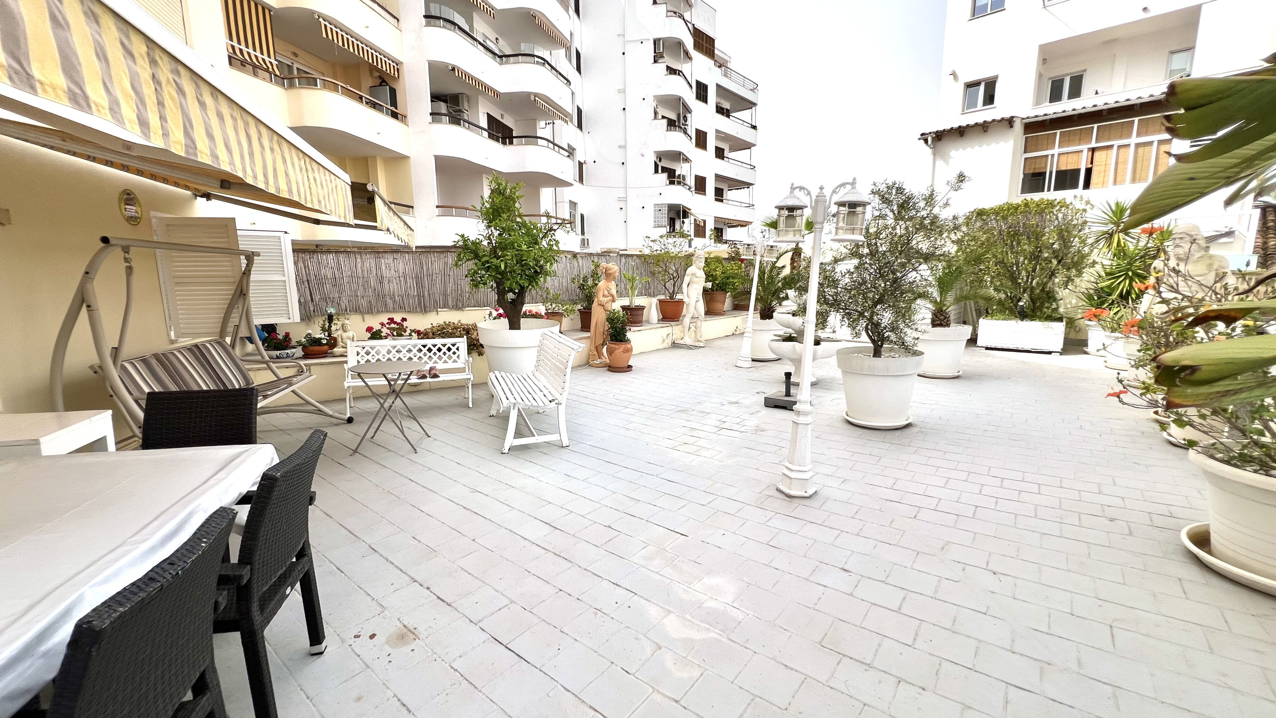 La joya de este piso es su gran terraza privada de unos 200 m², perfecta para disfrutar del clima mediterráneo. Imagina organizar barbacoas con amigos o simplemente relajarte en tu propio oasis ajardinado. El salón comedor, de grandes dimensiones, se conecta directamente con la terraza, creando un ambiente luminoso y acogedor. Además, la cocina independiente está totalmente equipada, lista para que des rienda suelta a tu creatividad culinaria.