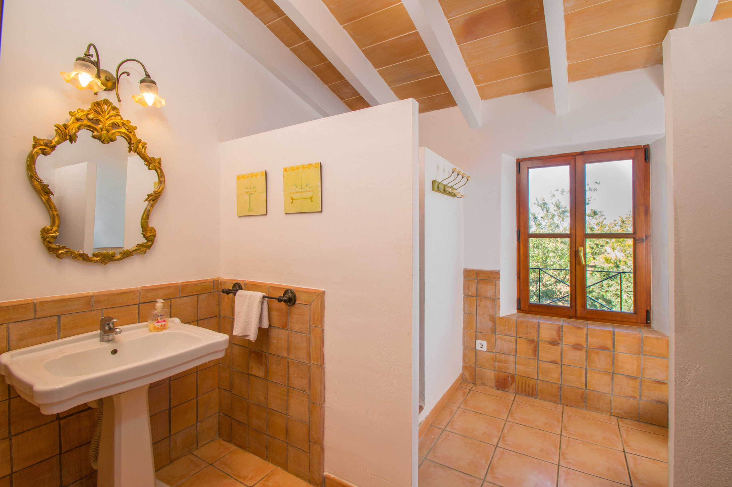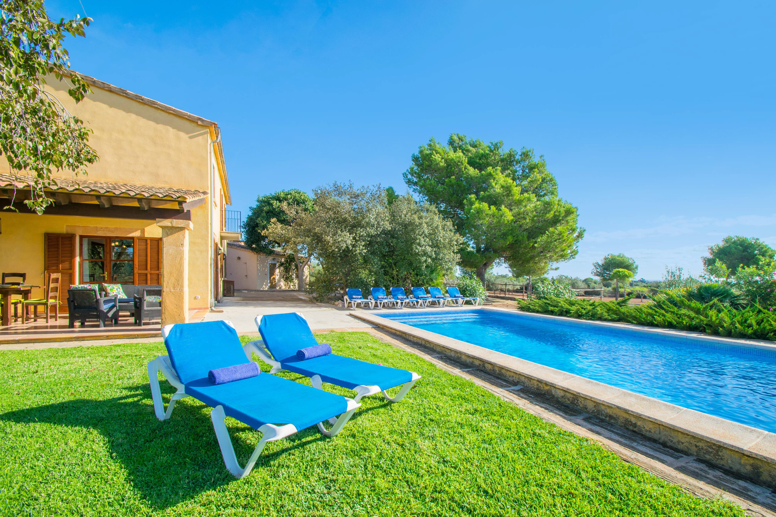 Im Außenbereich bietet die Finca einen privaten Pool, der von Schattenbereichen mit Sonnenschirmen und Liegen umgeben ist, perfekt zum Entspannen an Sommertagen. Zudem verfügt sie über einen Parkplatz innerhalb des Grundstücks.